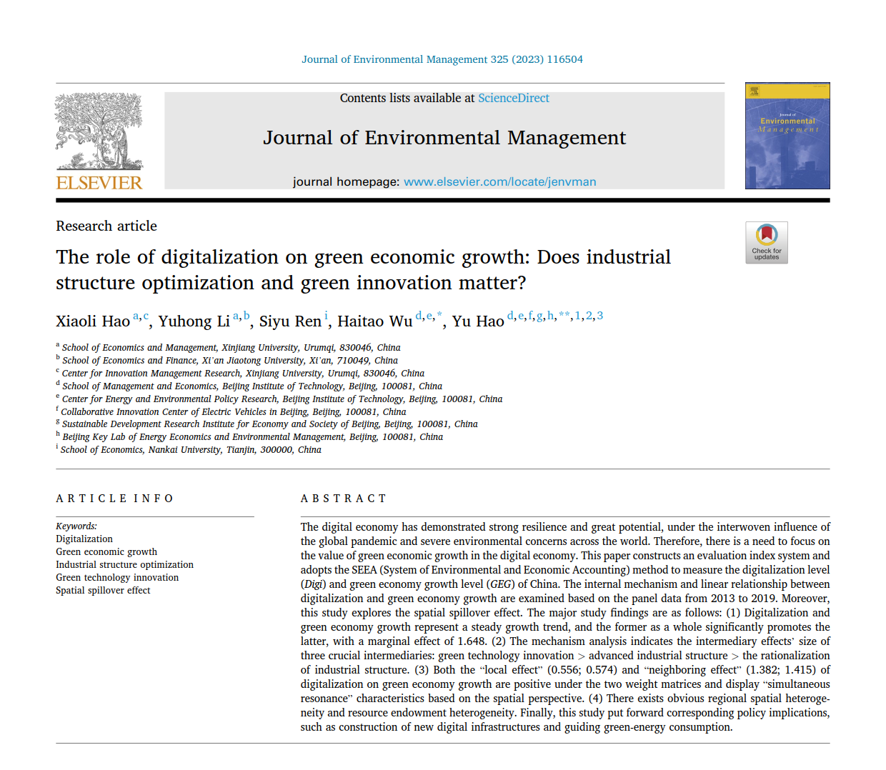 近日,半岛·体育中国官方网站平台登陆经济学专业2018级本科生李育红(导师:郝晓莉)的论文《The role of digitalization on green economic growth: Does industrial structure optimization and green innovation matter?》在国际期刊《Journal of Environmental Management》2023年第325卷发表。